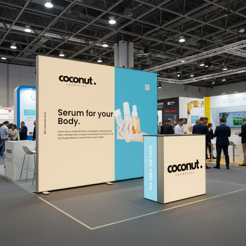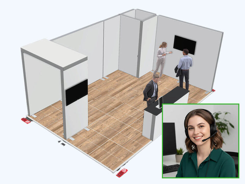 Von kleinen 3–6 m² Präsentationsflächen bis zu großen 50+ m² Messeständen. Durch das modulare System ist nahezu jede Form realisierbar.